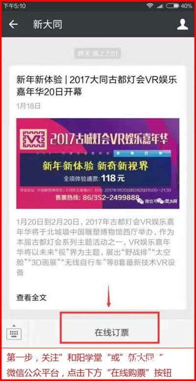 為了有更好的活動體驗,節(jié)省游客的排隊買票時間,古都燈火VR嘉年華特別在“大同市和陽學堂”和“新大同”微信平臺同時開設了網(wǎng)絡售票通道,無需排隊無需等待,關注“大同市和陽學堂”或“新大同”(微信號:sxdt_net)微信公眾平臺,在線購票后可以持電子門票掃碼直接入場。