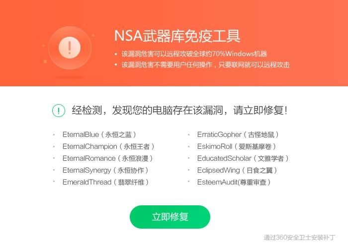 如果沒中毒,立即下載NSA武器庫免疫工具打補丁加固系統(tǒng),并下載文檔衛(wèi)士備份文檔