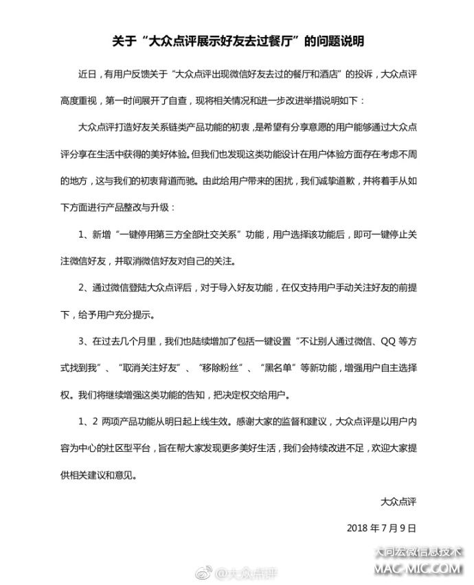 對(duì)此,大眾點(diǎn)評(píng)通過官方微博發(fā)布聲明,對(duì)因相關(guān)產(chǎn)品功能給用戶造成的困擾表示誠摯道歉,并提出了三條整改措施,包括新增“一鍵停用第三方全部社交關(guān)系”功能;通過微信登錄并導(dǎo)入好友關(guān)系,在支持用戶手動(dòng)關(guān)注的情況下給予充分提示;增加包括一鍵設(shè)置“不讓別人通過微信、QQ等方式找到我”“取消關(guān)注好友”“移除粉絲”“黑名單”等新功能。