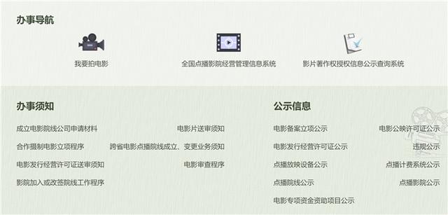 在國家電影局官網(wǎng)上,可以看到一些辦事導(dǎo)航,比如我要拍電影、全國點(diǎn)播影院經(jīng)營管理信息系統(tǒng)、影片著作權(quán)授權(quán)信息公示查詢系統(tǒng)等。